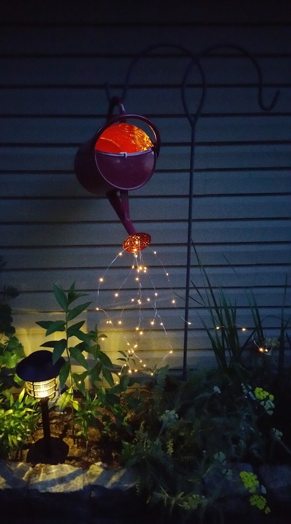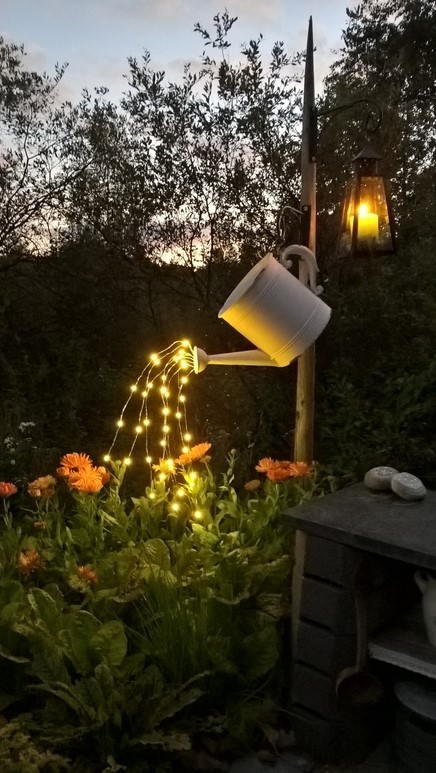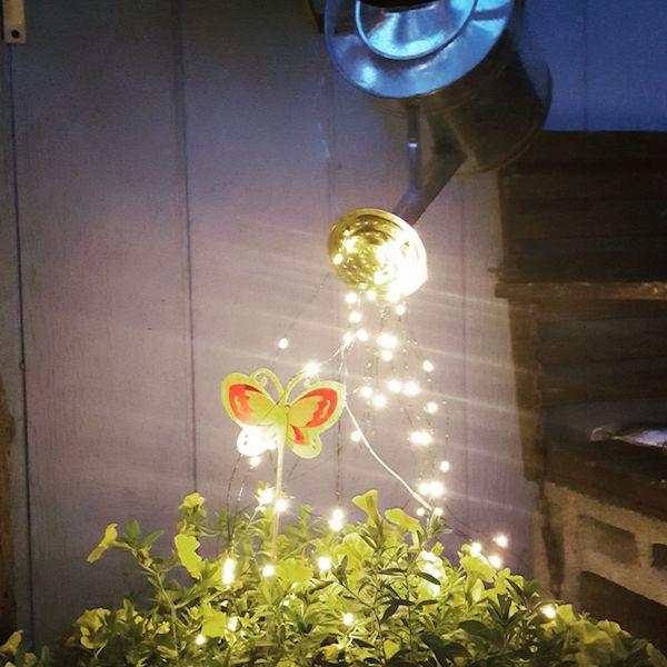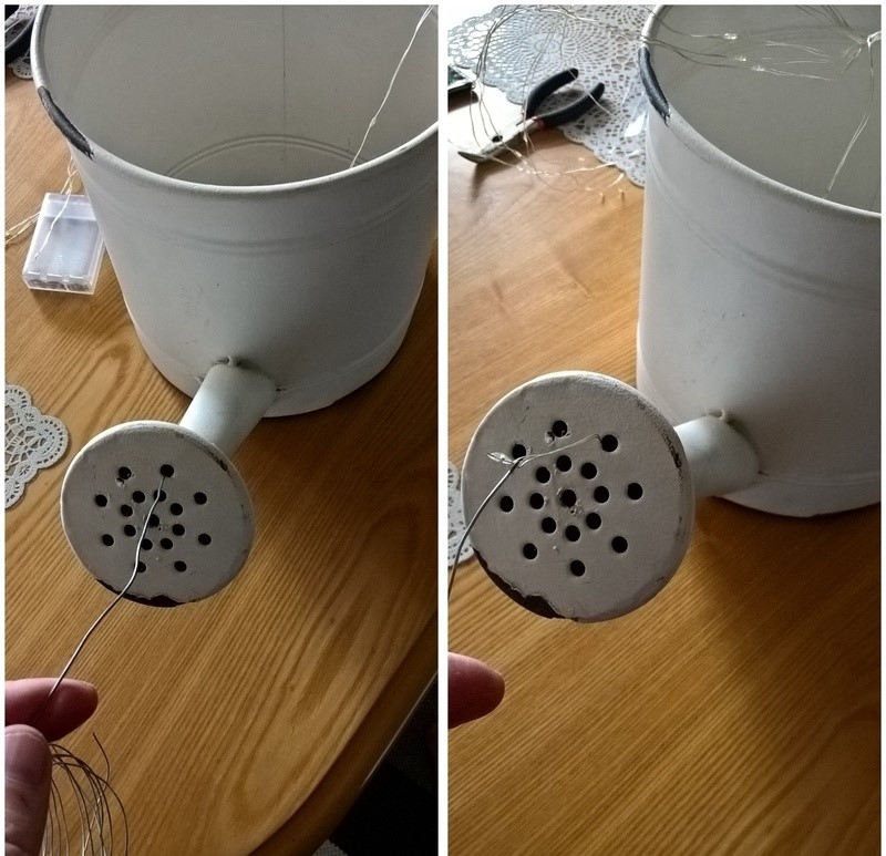 - Place the lights inside the watering can and push them up and out of the spout.