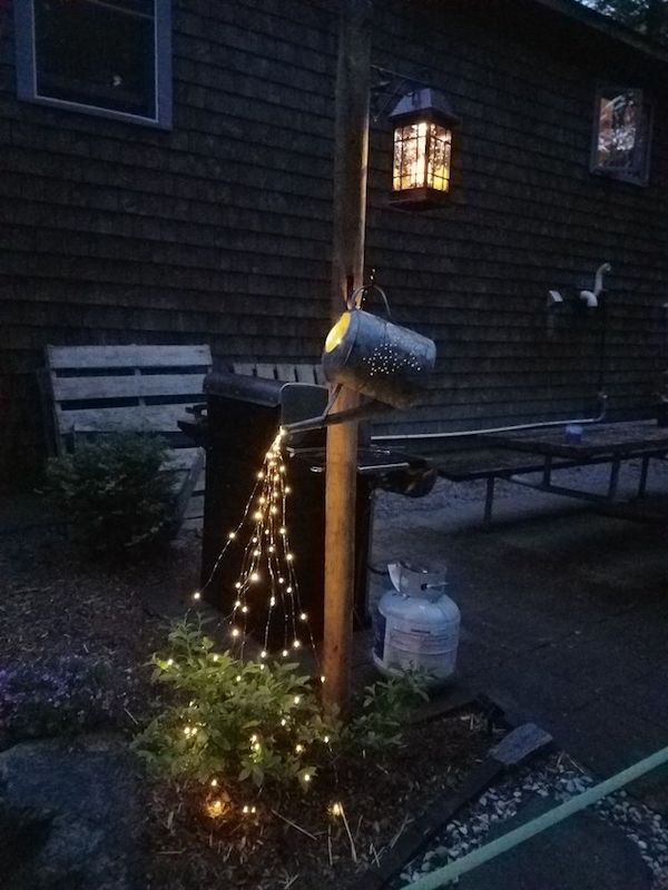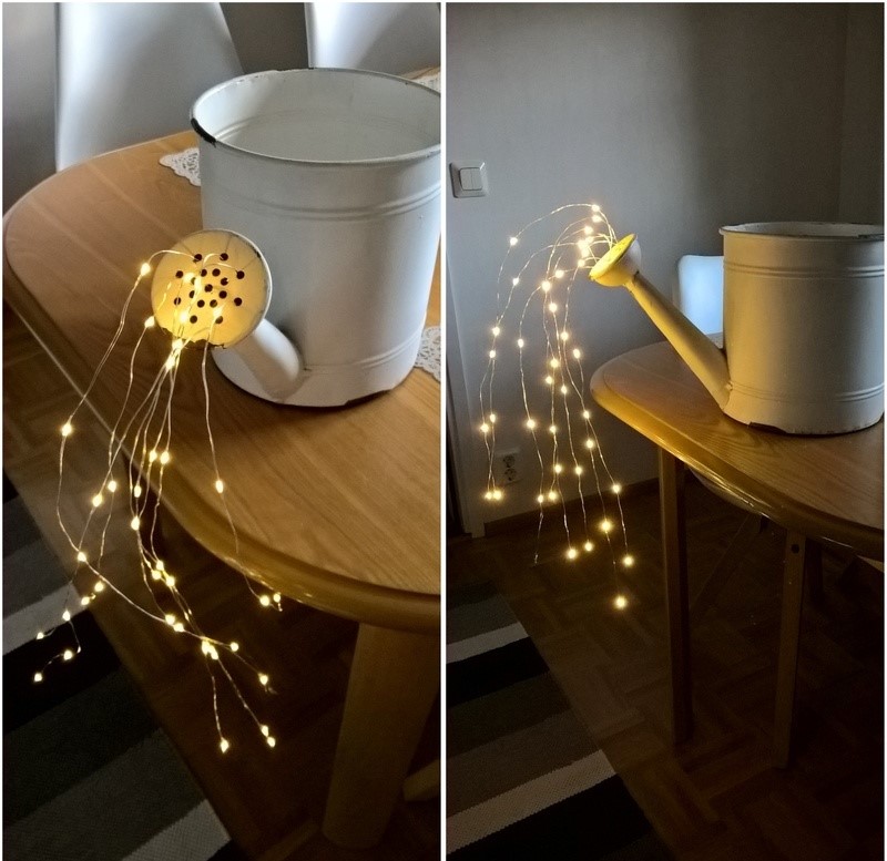 - A Watering can . Here’s a tip, make sure the watering can is large enough. If it is too small, it will be nearly impossible to get any lights into it properly.