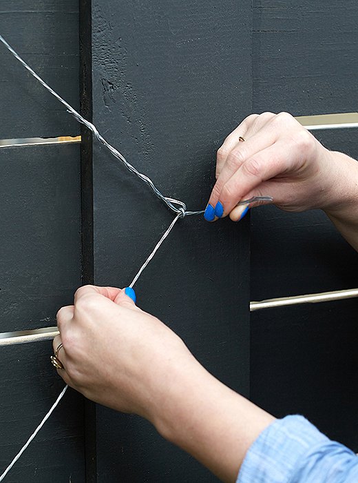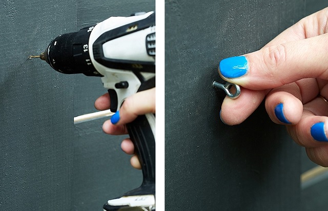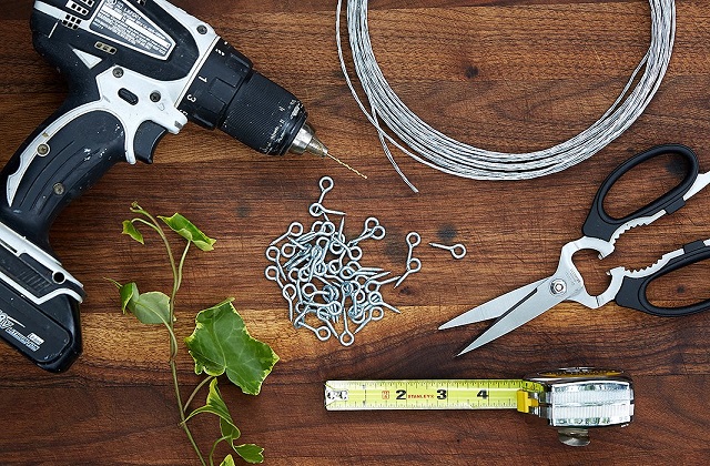 Once you have established the model, use a measuring tape and a pencil to mark the locations of the hooks. Use one hook at every net crossing point. Their number will vary depending on your particular layout. To make the hooks screwing a little easier, first drill a small hole. For plants with larger stems, such as hydrangea, you will need bigger hooks.