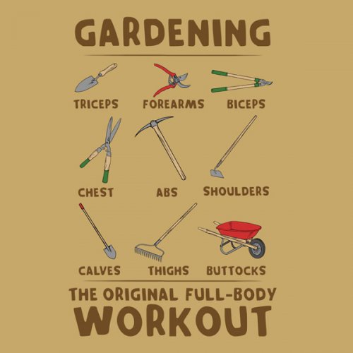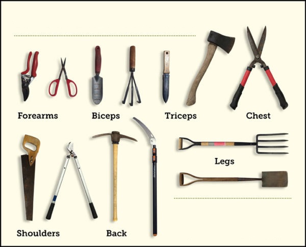 - Pruning, heavy digging, mowing the lawn or pushing a loaded wheelbarrow help in muscle building.