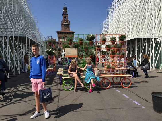 The wheeled gardens took on two forms, a vertical module with metal frame espaliers that allow flower pots to hang, and horizontal modules with a flat table top for flower beds. Each of module is mounted on steel frames connected to four recycled bicycle wheels, painted in bright colors to match the framework. In order to allow guests to enjoy the lush greenery, A4A installed wooden benches alongside each module, letting visitors breathe in the fresh scents of florals and herbs while they sat down for a rest.