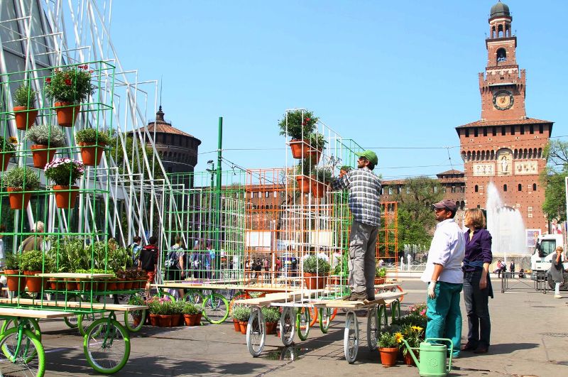 A4A Rivolta Savioni studio’s urban garden solution is situated in Milano. Easily movable on reused bicycle wheels, the public garden—called ‘Why not in the garden?’—was rolled out into the city square. The mobile garden can bring a wall of flowers or rows of edible plants to nearly any outdoor area.